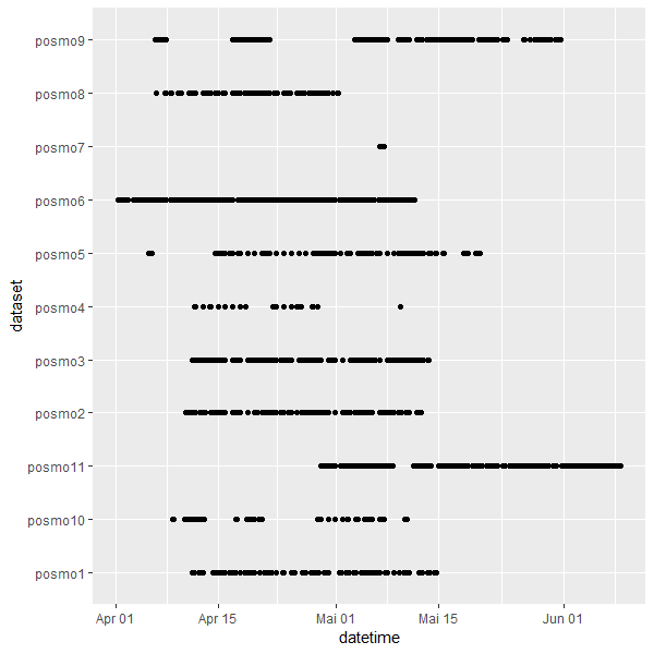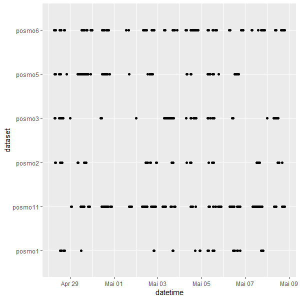 First we reviewed data consistency by creating a point plot, where every tracking point in time (x-axis) was displayed per user (y-axis). Five students needed to be eliminated due to insufficient tracking point coverage in time (Fig. 1). Additionally, the dataset was cut into a specific timeframe (28.04.2023 - 09.05.2023) covering 11 days to ensure sufficient overlap of tracking points between users (Fig. 2).