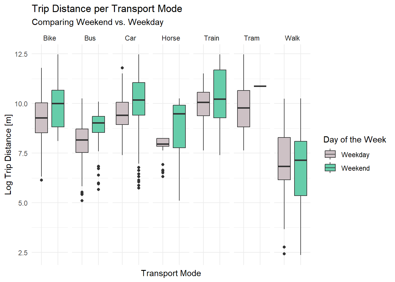 labs(title = "Trip Distance per Transport Mode", subtitle = "Comparing Weekend vs. Weekday", fill = "Day of the Week") +