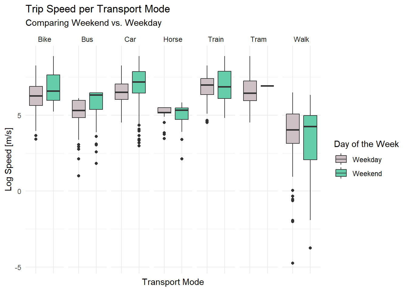 labs(title = "Trip Speed per Transport Mode", subtitle = "Comparing Weekend vs. Weekday", fill = "Day of the Week") +