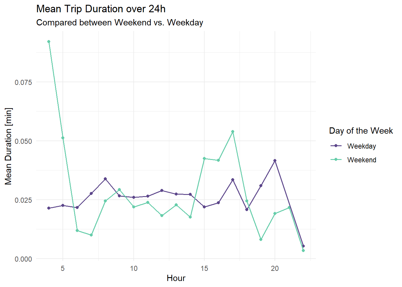 labs(title = "Mean Trip Duration over 24h", subtitle = "Compared between Weekend vs. Weekday", color = "Day of the Week") +