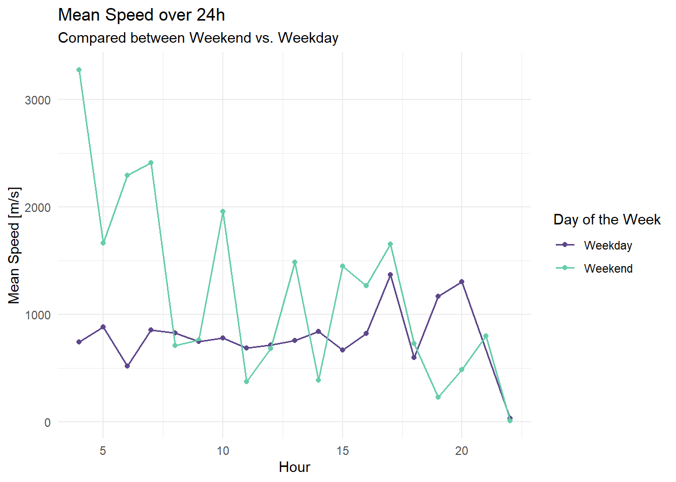 labs(title = "Mean Speed over 24h", subtitle = "Compared between Weekend vs. Weekday", color = "Day of the Week") +