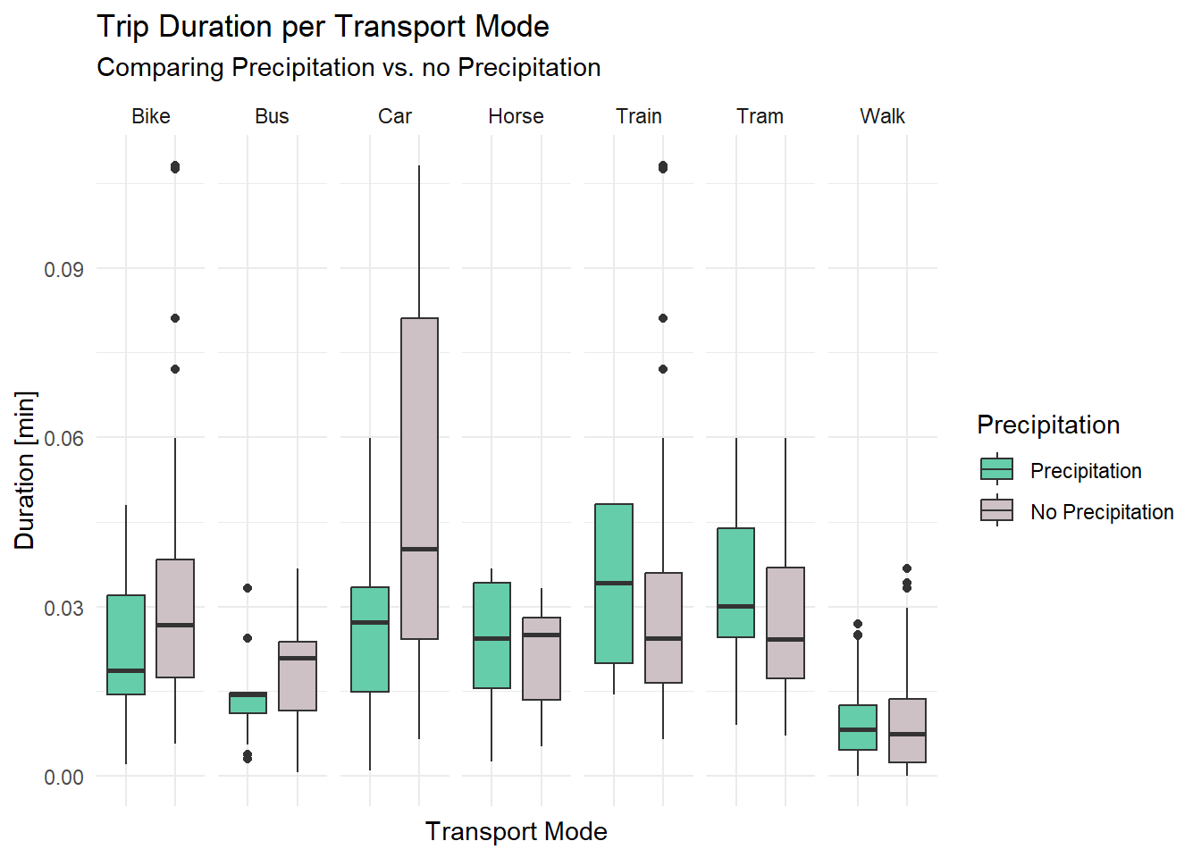 labs(title = "Trip Duration per Transport Mode", subtitle = "Comparing Precipitation vs. no Precipitation", fill = "Precipitation") +