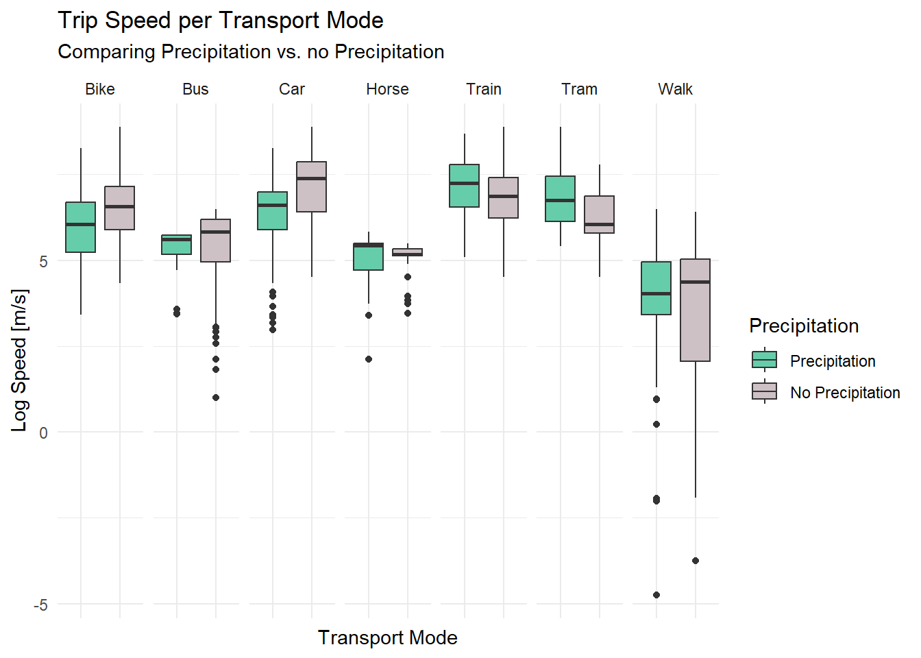 labs(title = "Trip Speed per Transport Mode", subtitle = "Comparing Precipitation vs. no Precipitation", fill = "Precipitation") +