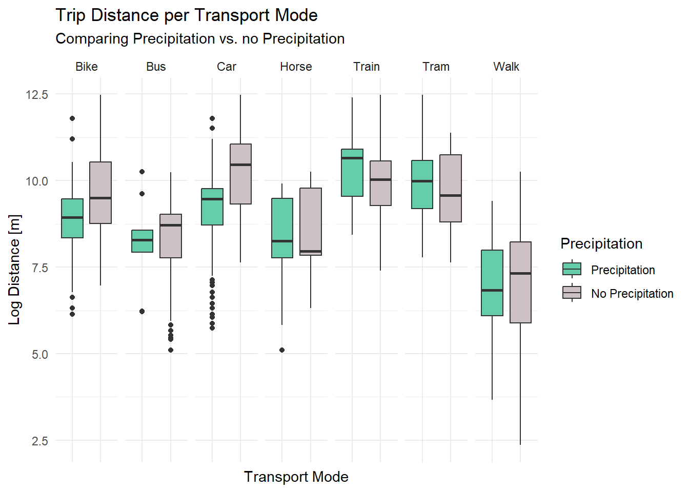 labs(title = "Trip Distance per Transport Mode", subtitle = "Comparing Precipitation vs. no Precipitation", fill = "Precipitation") +