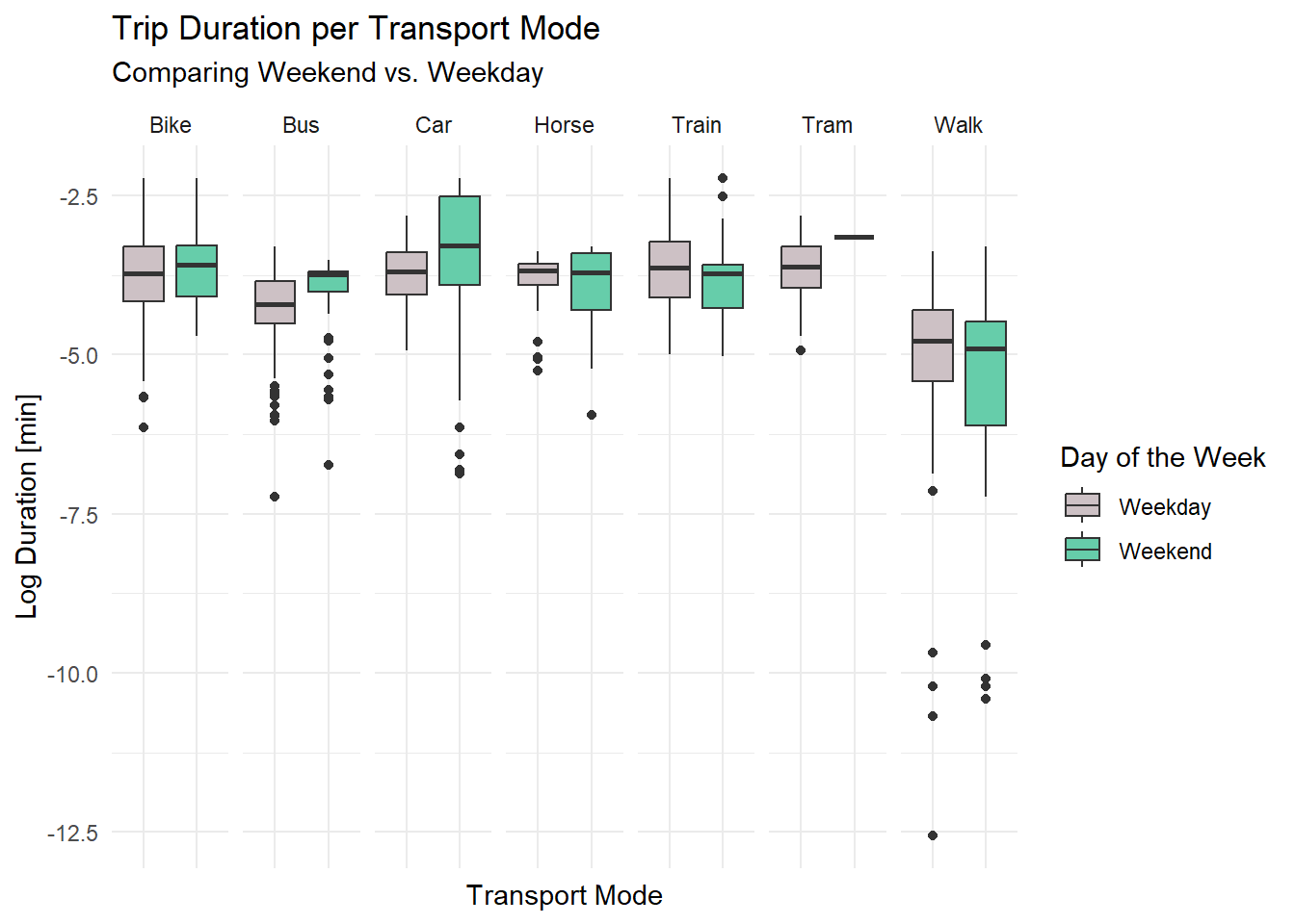 labs(title = "Trip Duration per Transport Mode", subtitle = "Comparing Weekend vs. Weekday", fill = "Day of the Week") +