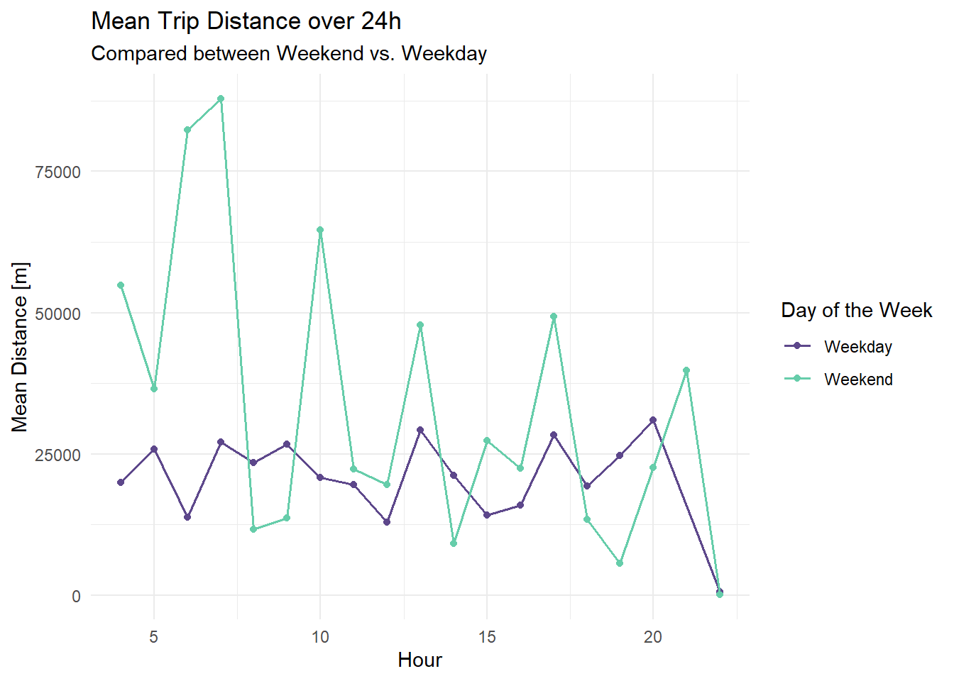 labs(title = "Mean Trip Distance over 24h", subtitle = "Compared between Weekend vs. Weekday", color = "Day of the Week") +